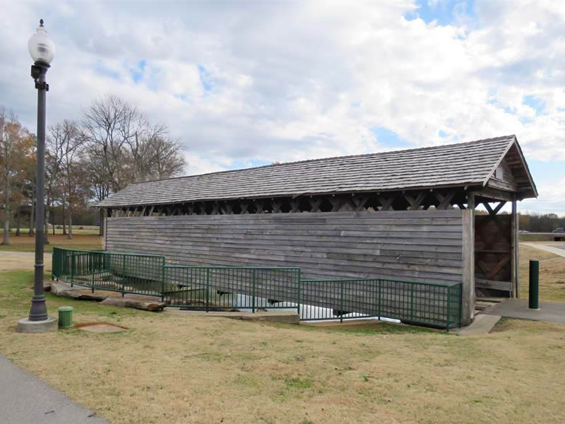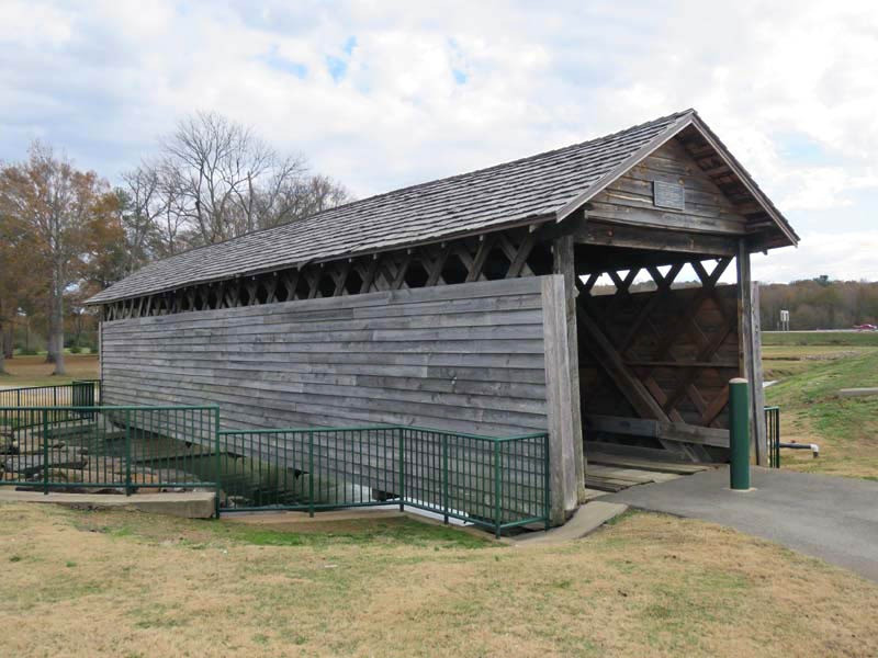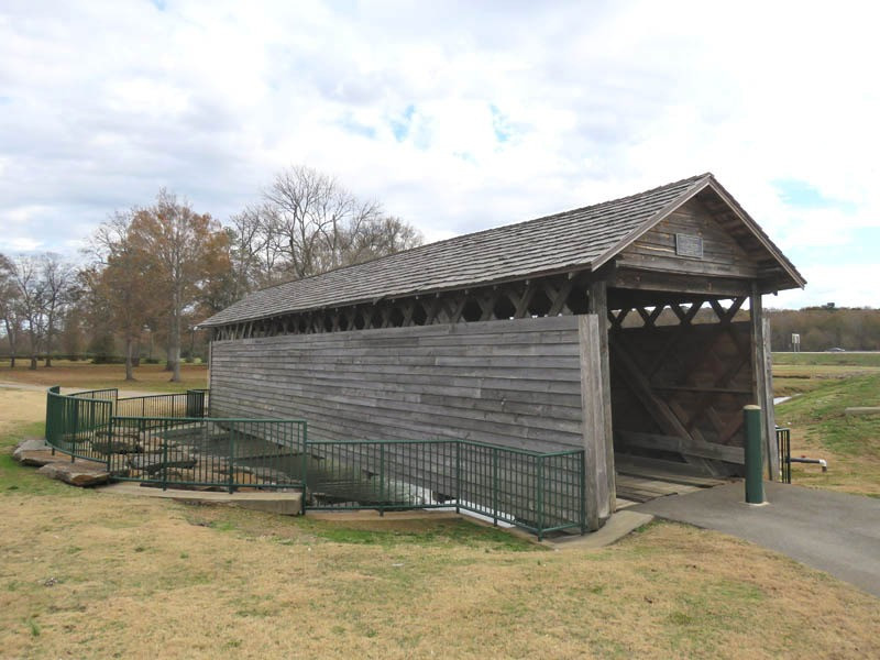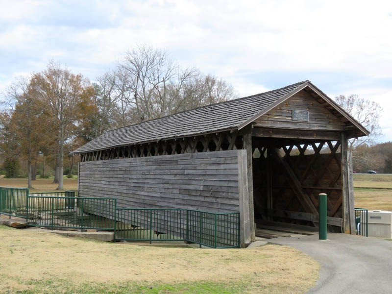 The Coldwater Covered Bridge was built by a former slave around 1850 (although some sources say it was built as early as 1839), originally located over Coldwater Creek. Nearby was Coldwater Mill, also known as Hughes Mill, a local saw and lumber mill owned by Peter N. Hughes and Humphrey Hughes. The bridge partially burned in the early morning hours of August 11, 1920, but was able to be repaired and remain open to motor vehicle traffic. A concrete and steel bridge eventually replaced the aging Coldwater Covered Bridge in 1974, which was soon left to temporarily survive the elements. In 1990, the bridge was fully restored and moved to Oxford Lake Park. The original tin roof has been replaced with a shingled roof. It is now one of the many visited tourist attractions within the Anniston area.