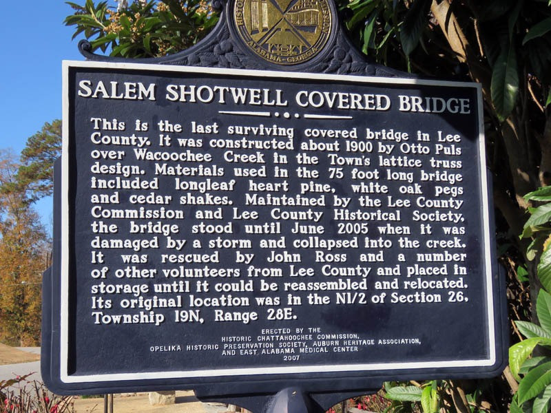 After months of negotiations, the Lee County Commission approved the transfer of ownership of what remained of the Salem-Shotwell Covered Bridge to the City of Opelika during a meeting held on October 31, 2005. An agreement was reached by the Lee County Historical Society and the Opelika Kiwanis Club to reconstruct the bridge over Rocky Brook at Opelika Municipal Park. A resolution was unanimously passed on April 4, 2006, by the Opelika City Council to assist with the bridge relocation and renovations. The project was spearheaded by the Opelika Kiwanis Club, which had already begun a donation drive to raise the funds needed in order to proceed with the move. A number of individuals, businesses, and organizations donated money for the greatly valued cause.