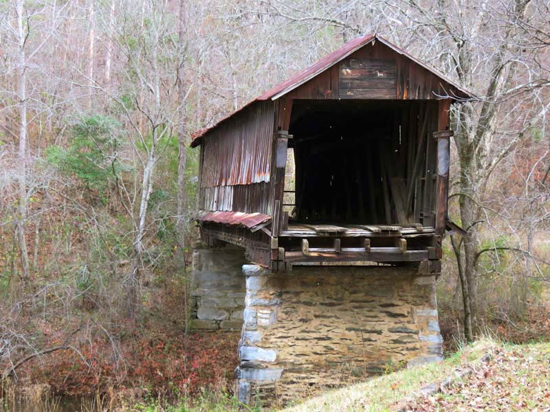 The Waldo Covered Bridge was built on an old Socopatoy Indian trail behind Riddle's Mill, a grist mill that was later converted into the Waldo Town Hall and then a restaurant. Nearby is the Riddle's Hole gold mine, which operated from 1840 through World War II. The bridge was used as an access route in April 1865 by Wilson's Raiders during the American Civil War, a cavalry group led by Union Army General James H. Wilson. The bridge was open to traffic in later years, possibly for mine access during its operation, but condemned by the state in the 1960s, and the approaches were removed as overall maintenance remained minimal. Even though there was extensive restoration work done to the Waldo Covered Bridge in recent years as part of establishing a recreational park, the project was soon scrapped. As a result, the structure was left to sit on its two stone piers "as is." The Waldo Covered Bridge is currently inaccessible to the public, but people can walk the grounds with permission from the Old Mill Restaurant. There were plans by the owners to once again restore the bridge, but time and money have been major issues. The restaurant closed, and the property went up for sale.