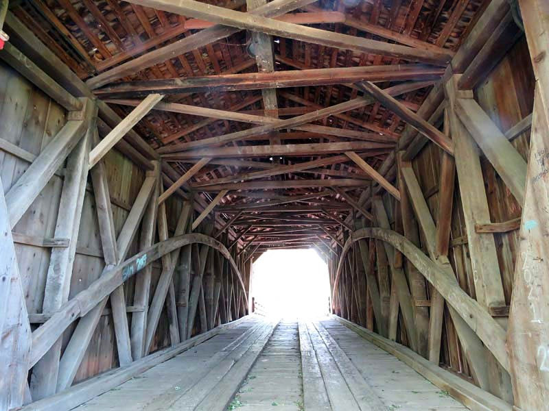 According to Bettendorf’s article, a 1972 survey by the National Society for the Preservation of Covered Bridges dated today’s Sugar Creek Covered Bridge to 1880. The survey also called it “Headley Bridge,” apparently a reference to James Headly, who owned property adjacent to the bridge in the 1880s.