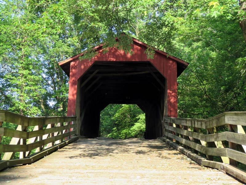 The Sugar Creek Covered Bridge is in Pioneer Park, a small park owned by the Chatham Park District.