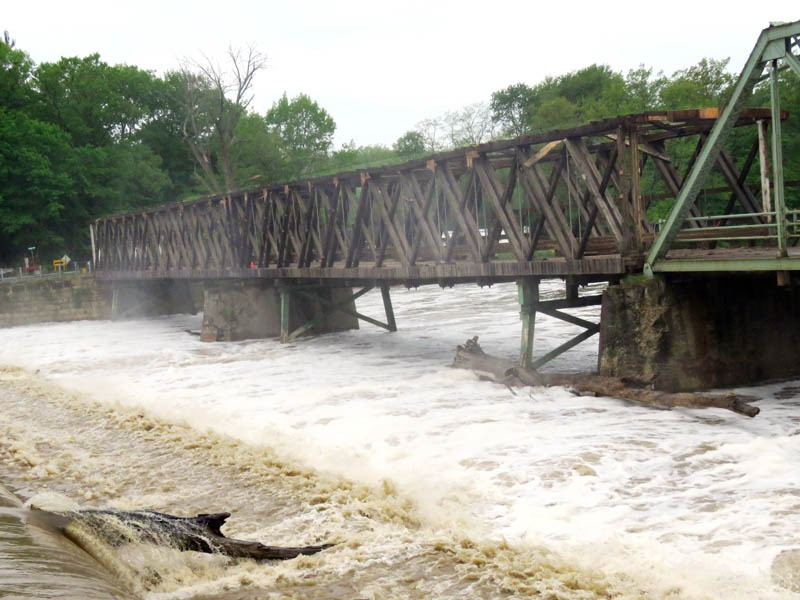 A flood in 1913 washed away the land at the north end of the bridge, and an 8-panel steel Pratt through-truss span of 140 feet with an approach was subsequently attached. The bridge was bypassed when State Route 534 was rerouted around the settlement of Harpersfield. The bridge features a walkway, added during its renovation in 1991-92.