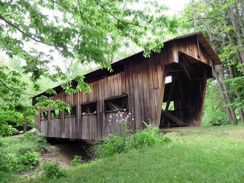 The Jasper Road Covered Bridge is a 50-foot covered Warren through truss over Mudlick Creek west of Germantown in Montgomery County, Ohio. It was constructed by the Smith Bridge Company of Toledo in Greene County in 1877 over Caesar’s Creek southwest of Jamestown for $6.95 per linear foot. In 1964, Huston Brown, a Dayton industrialist, had the covered bridge moved to his estate and ex-mill near Germantown in Montgomery County, and the bridge was rebuilt over Mud Luck Creek. The dark brown covered bridge and the mill are for sale and can be seen safely from the road. Two historic markers also stand next to the covered bridge.