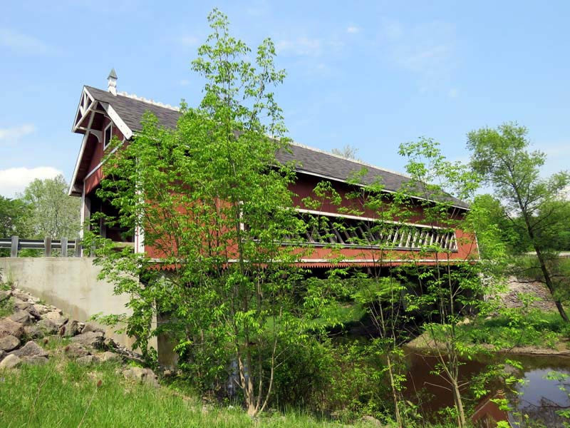 The Netcher Road Bridge is a covered bridge spanning water in Jefferson Township, Ashtabula County, Ohio. The bridge, one of the newest and one of the currently 17 drivable covered bridges in the county, is a single-span constructed of timber arches with inverted Haupt walls, in a "Neo-Victorian" design. It was built in 1998, and it was funded by an ODOT Timber Grant.