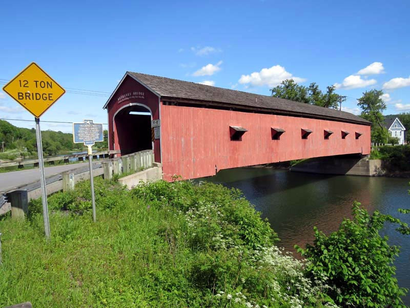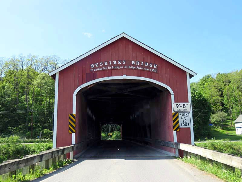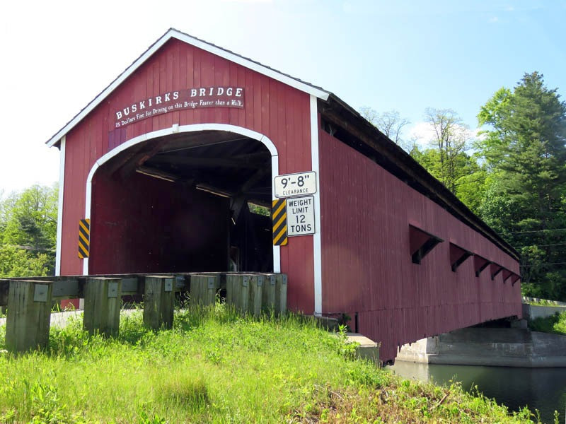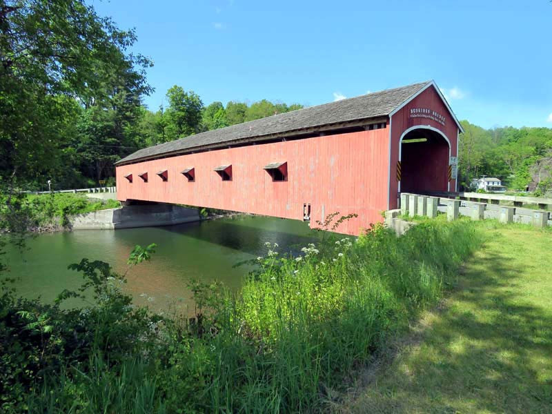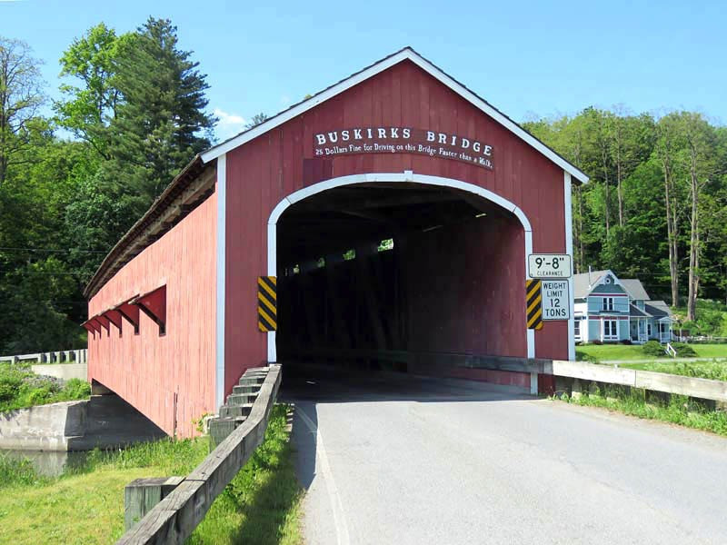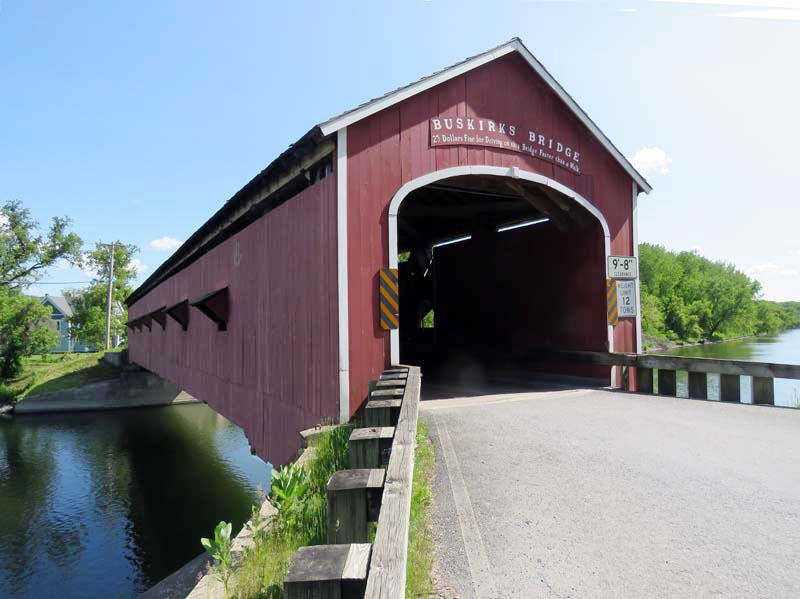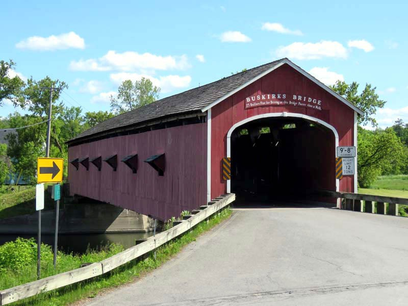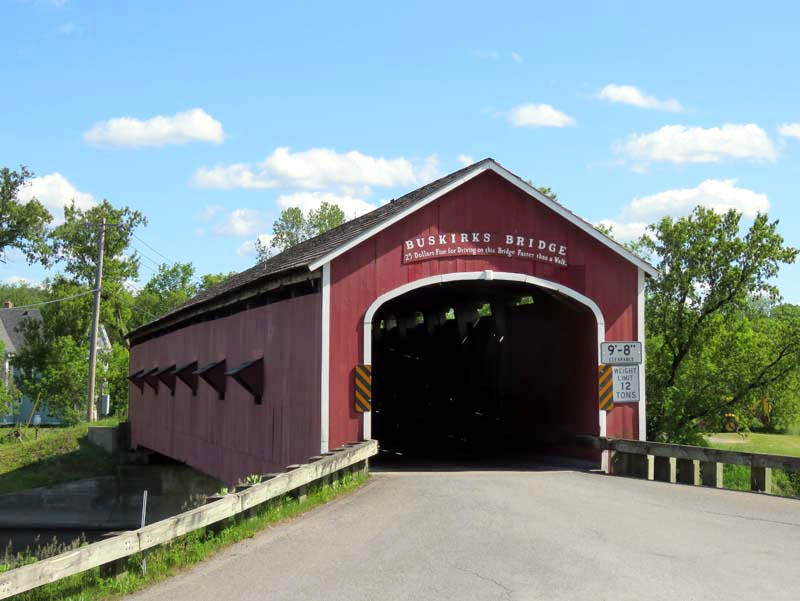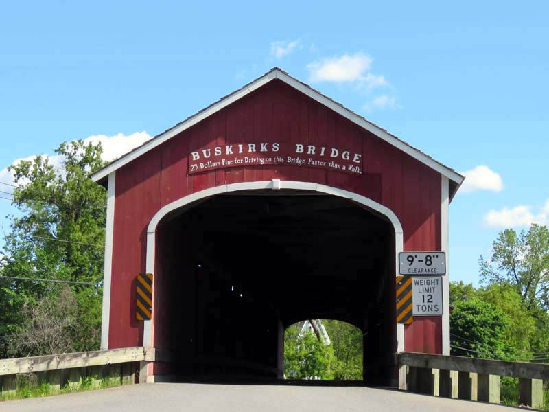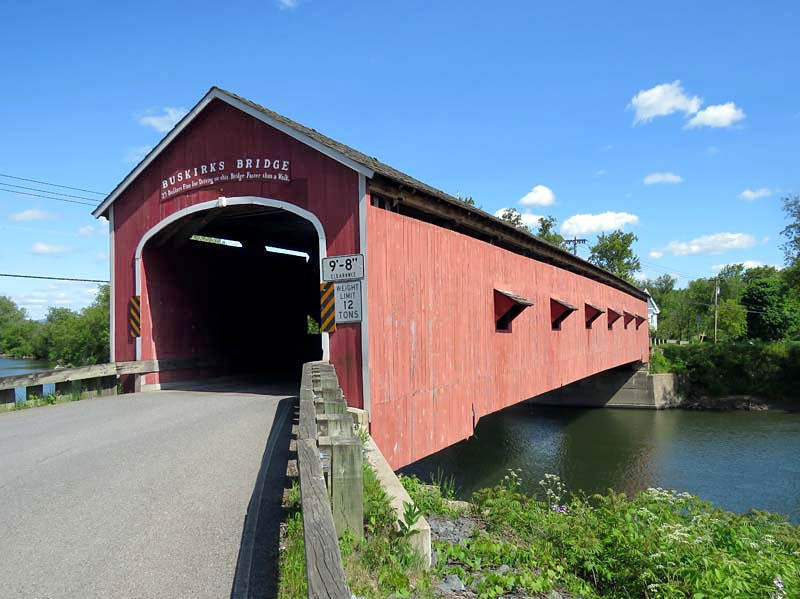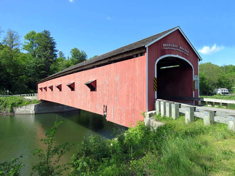 The 1857 Buskirk Covered Bridge is the name of the hamlet in which it is located and is in the town of Hoosick, Rensselaer County, New York. It is the only inter-county covered bridge in New York State, joining Rensselaer and Washington Counties, and is owned and maintained by both counties. The bridge, which crosses the Hoosic River, is one of 29 historic covered bridges in New York State. The nearby hamlet was named after the local Van Buskirk family. This single span of 158 feet crossing the Hoosic River was built by Peter Osterhauth, Charles Newman, and James Roberts.
