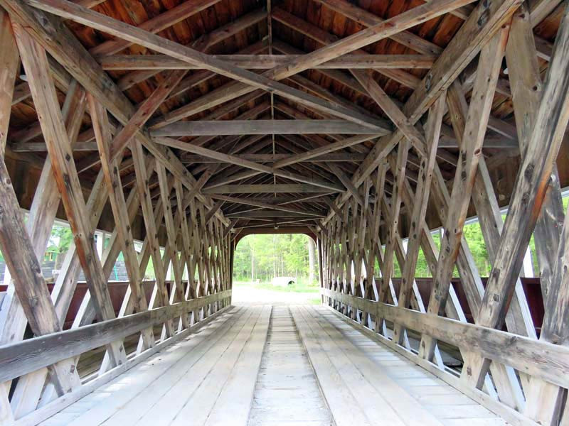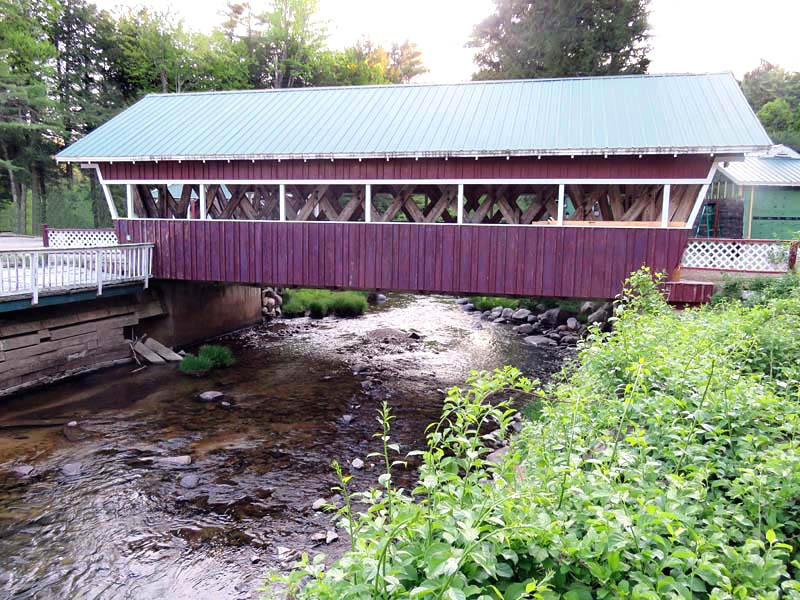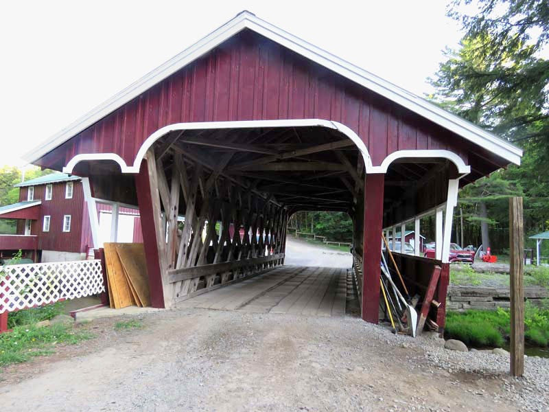 The same waters of the Kennyetto Creek that power the water wheel also flow under the Eagle Mills Covered Bridge. When John Gasner built this bridge, he used lumber milled at local sawmills from area trees. The large under-span beams were recovered from the dismantling of an old Amsterdam, New York, carpet mill. These massive beams, now serving as part of the Eagle Mills Covered Bridge, once held the weight of massive carpet looms from years past.