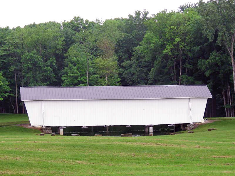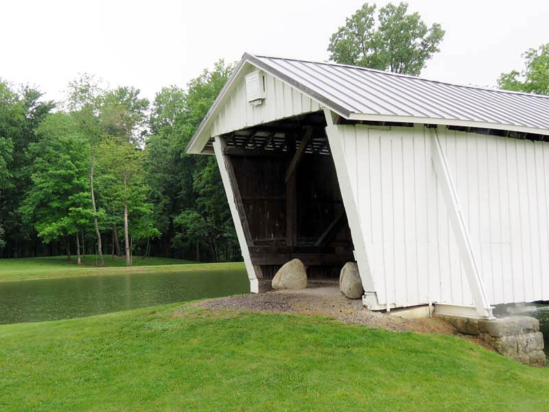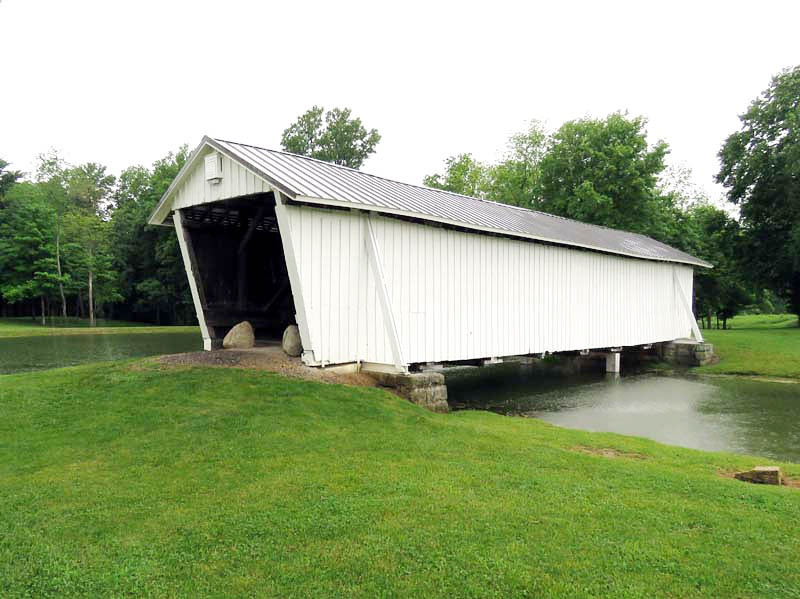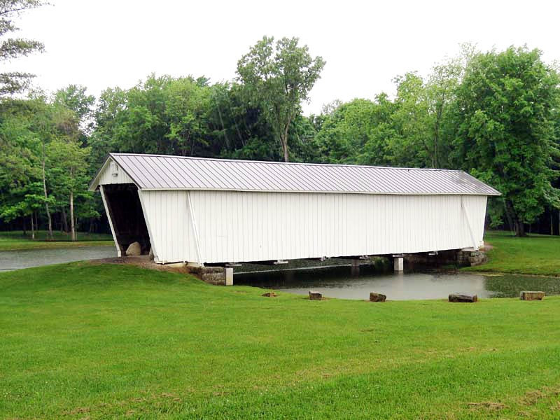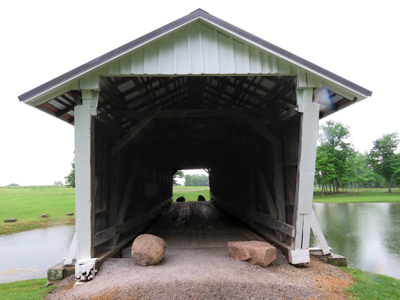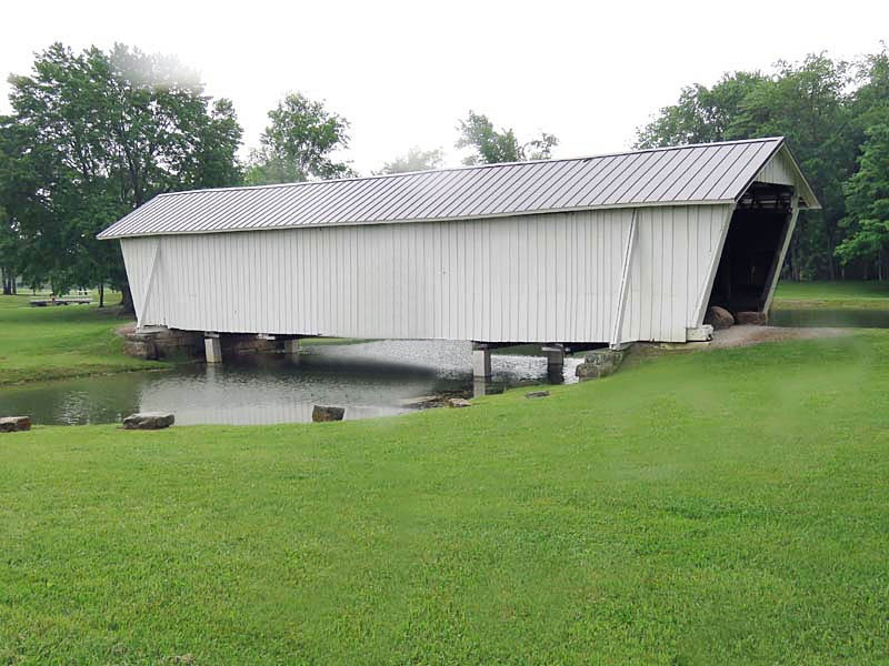 The R.F. Baker Covered Bridge, also known as the Winegardner Bridge, is an 80-foot-long Multi-Kingpost through truss that was built in 1871 by James Arnold to span Little Rush Creek at Drum Bottom Road near Winegardner Mill. Rush Creek Lake inundated its original location, and the bridge had to be rescued. It was removed and reconstructed over a small lake on the grounds of Fairfield Union High School in 1981 and has since been used as a special student project to protect it. The bridge, now halfway through its second century of use, is open to pedestrian traffic only, sitting peacefully behind the school facilities.