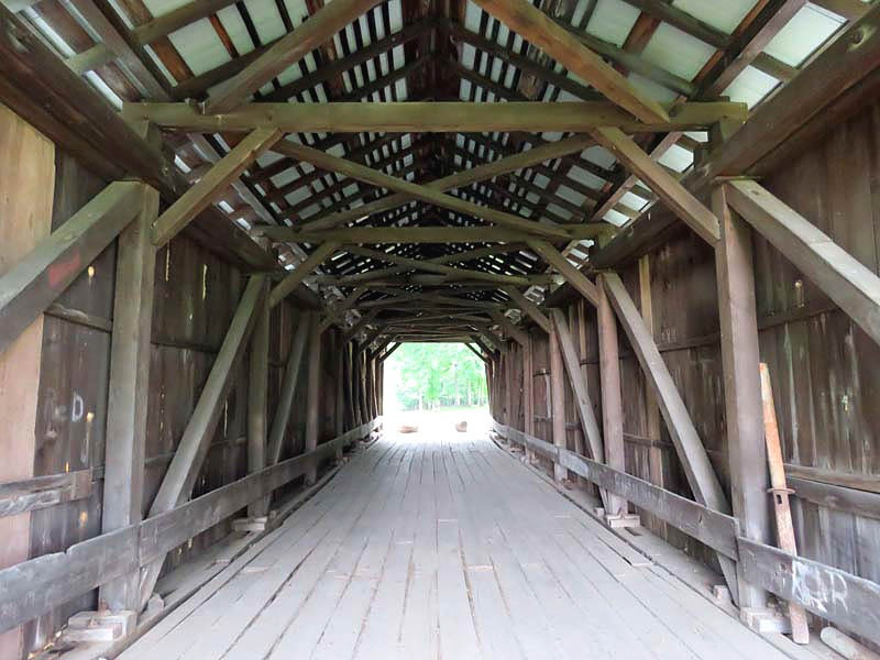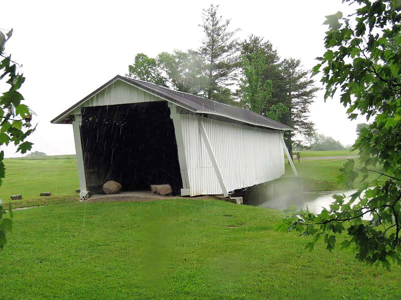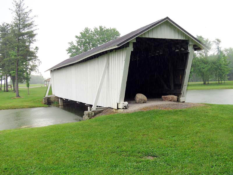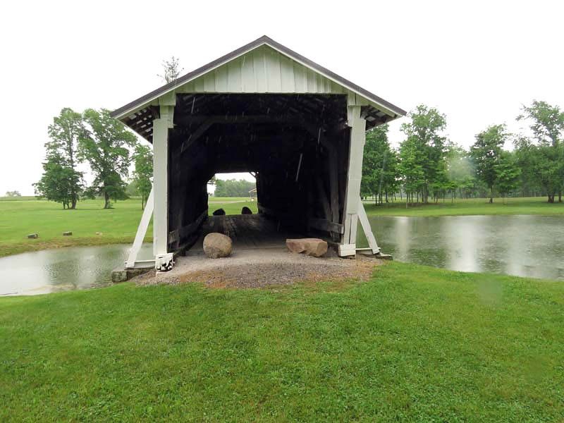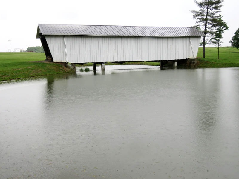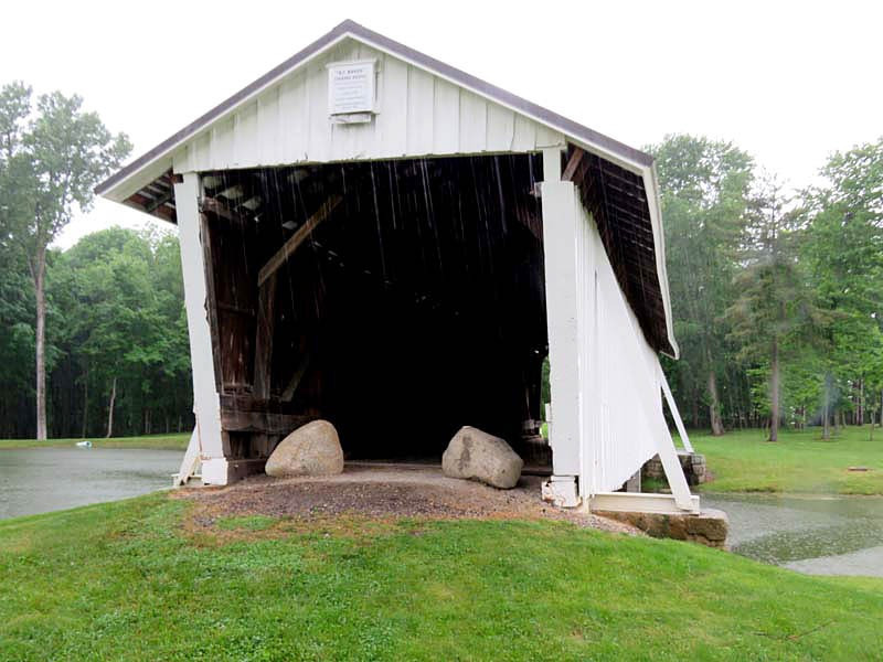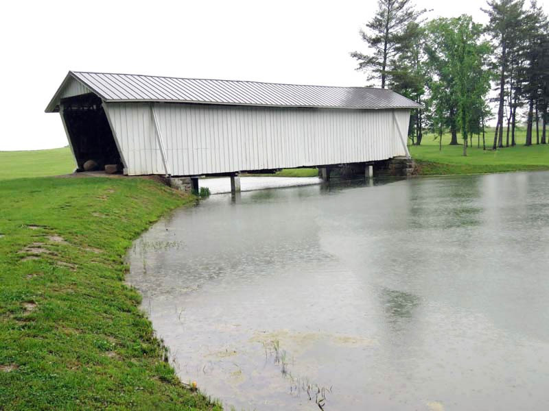 The R.F. Baker Covered Bridge, also known as the Winegardner Bridge, is an 80-foot-long Multi-Kingpost through truss that was built in 1871 by James Arnold to span Little Rush Creek at Drum Bottom Road near Winegardner Mill. Rush Creek Lake inundated its original location, and the bridge had to be rescued. It was removed and reconstructed over a small lake on the grounds of Fairfield Union High School in 1981 and has since been used as a special student project to protect it. The bridge, now halfway through its second century of use, is open to pedestrian traffic only, sitting peacefully behind the school facilities.