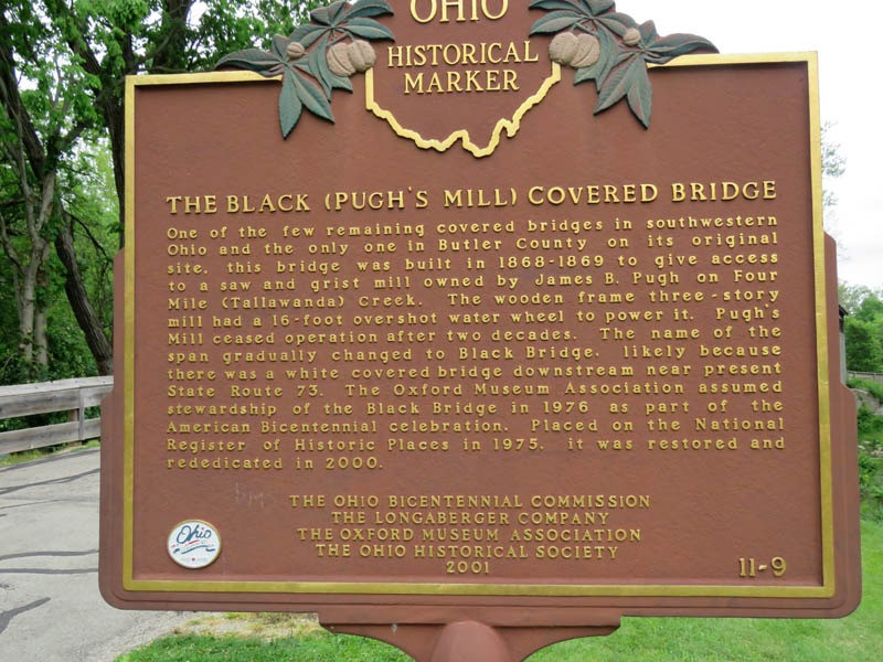 The Black Covered Bridge, also called Pugh's Mill Covered Bridge, is a registered historic structure near Oxford, Ohio. This 206-foot combination Long/Childs trusses wooden bridge was built in 1869 over Four Mile (Talawanda) Creek by Bandin, Butin, and Bowman and is one of two remaining covered bridges in Butler County, Ohio. The other is the Bebb Park or State Line covered bridge, built in 1868.