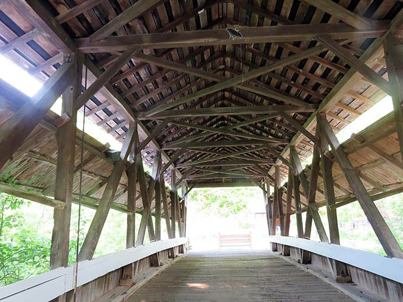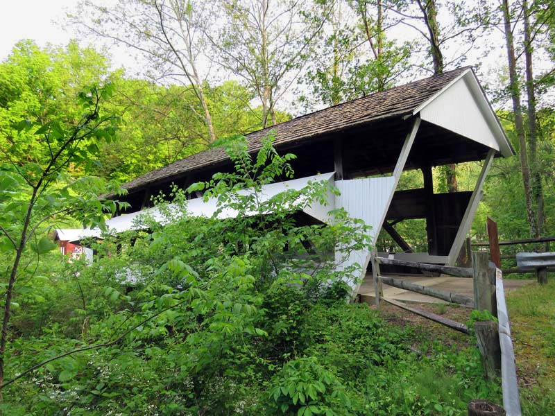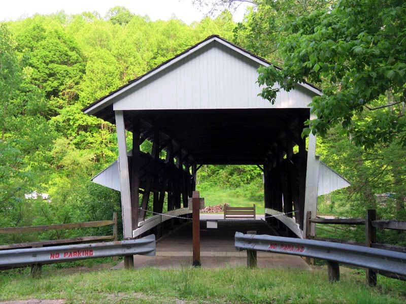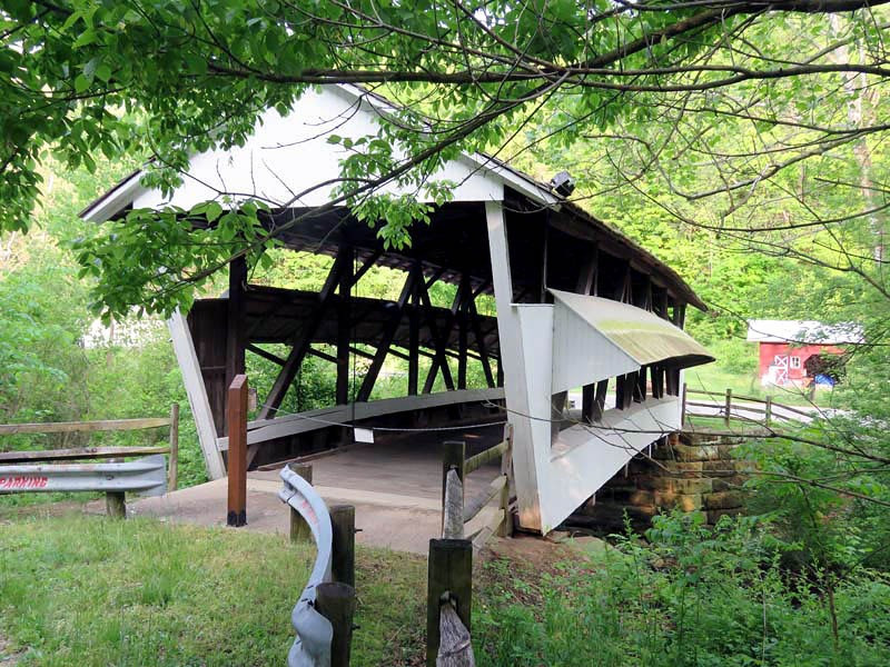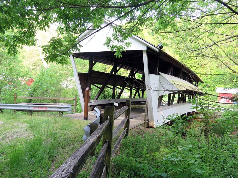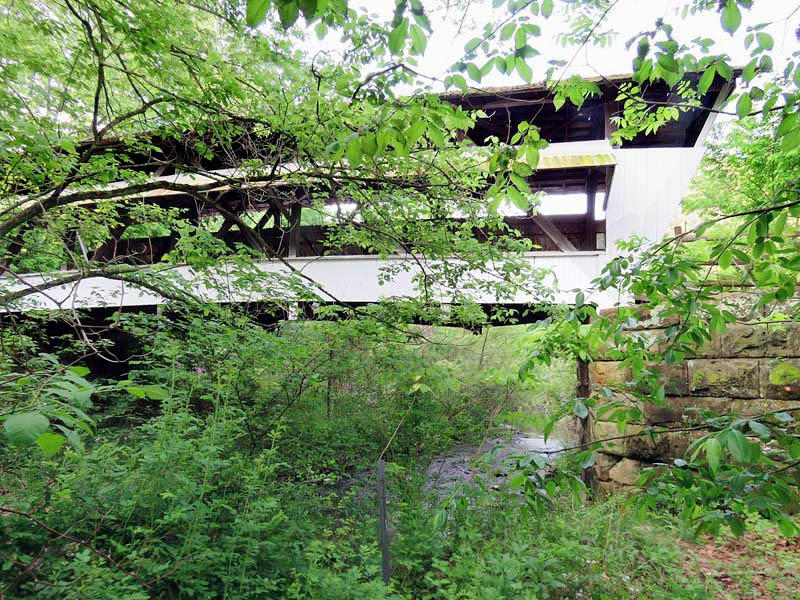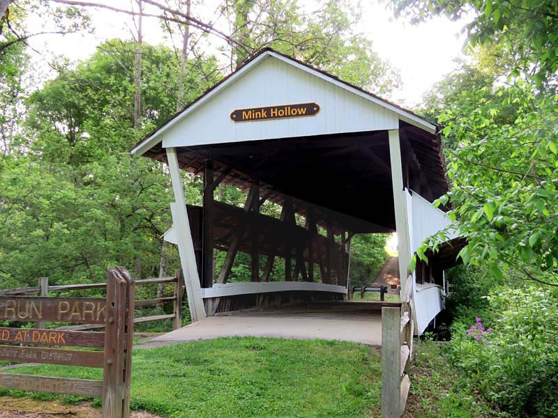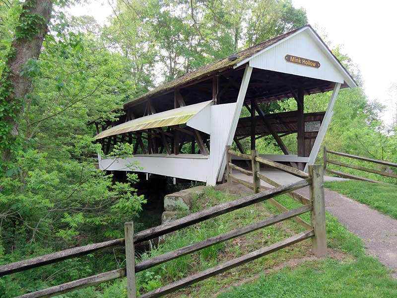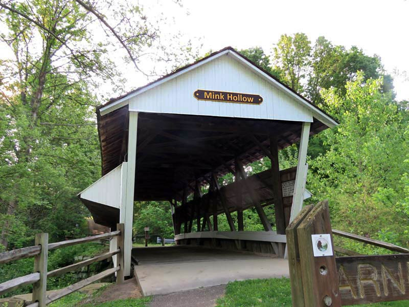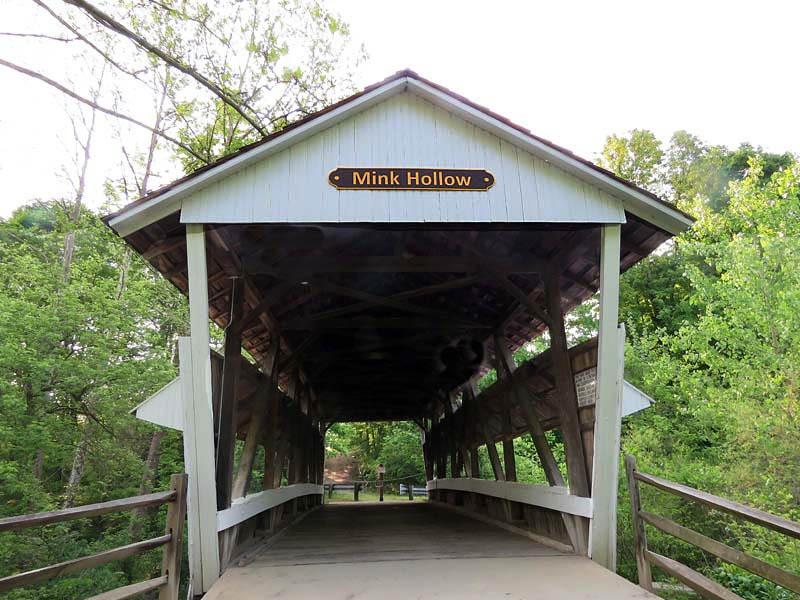 Mink Hollow Covered Bridge is a shortened version of its original name. The bridge actually has the longest name of any covered bridge in the USA: "The Mink Hollow Covered Bridge in Oil Mill Hollow Over Arney Run Near Borcher's Mill." Borcher’s Mill was also called Oil Mill because it converted flaxseed into linseed oil. The oil often floated atop the waters of Arney Run. The bridge has also been referred to as Oil Mill Hollow Bridge.