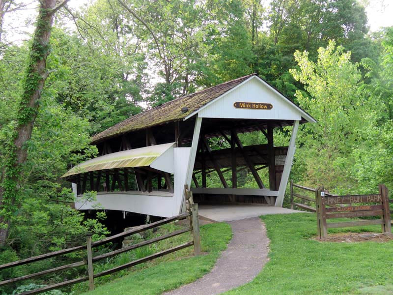 The 1887 Mink Hollow Covered Bridge crosses Arney Run in Fairfield County, Ohio. This 54-foot-long span has 7-foot overhangs at each end and is 14 feet wide and 12 feet tall. The bridge was built by Jacob R. "Blue Jeans" Brandt using a Multiple Kingpost Truss with a central X brace and remains in its original location.