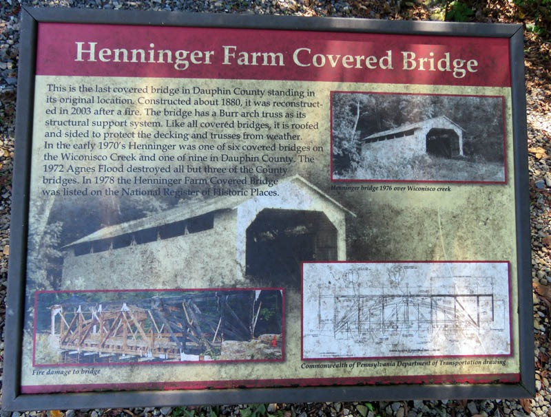 Also called Stroup Bridge, this is the last covered bridge in Dauphin County standing in its original location. It was reconstructed in 2003 after a fire. In the early 1970s, Henniger was one of six covered bridges on the Wiconisco Creek and one of nine in Dauphin County. The 1972 Agnes flood destroyed all but three of the county bridges.