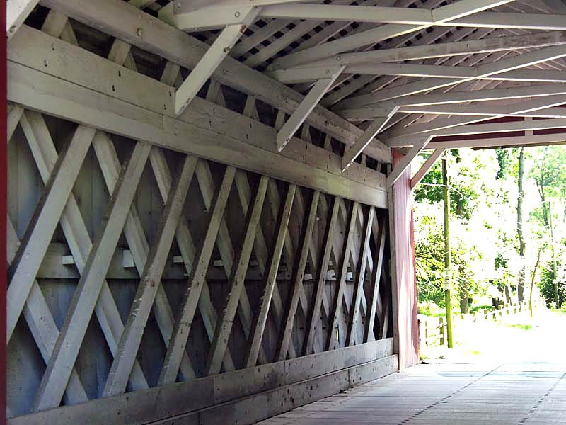 The original ‘Town Lattice’ Truss-covered bridge was built circa 1850. The bridge deck was rehabilitated in 1964. A complete rehabilitation and steel beams were added in 1982. Rehabilitation of the stone foundation and replacement of the wooden roof, siding, and deck in 2008. The bridge is 52 feet long.