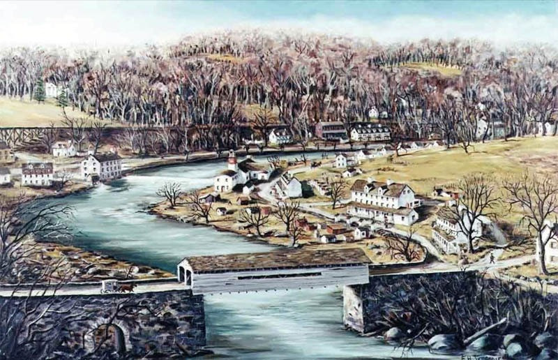 Historical painting of the Covered Bridge crossing the Brandywine near Wilmington's Dupont Powder Mills in the early 1800s. This bridge was later replaced with a modern bridge crossing the Brandywine.
