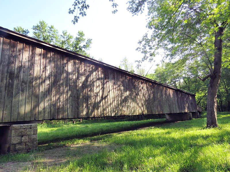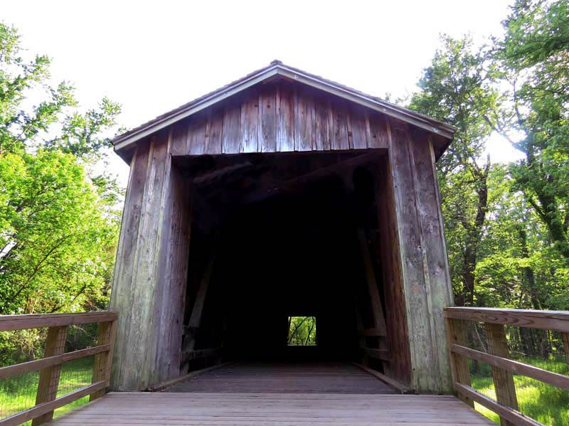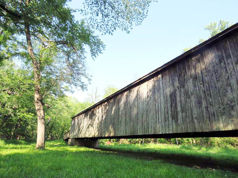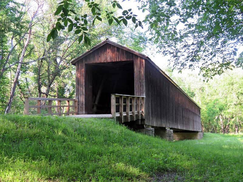 In August 1868, a contract was awarded by the Linn County Commissioners to Bishop & Eaton for a single-lane bridge across Locust Creek, with the cost not to exceed $5,500. Patented in 1840, this Howe truss design was constructed of white pine. True to its design, vertical iron rods tightly secure diagonal wooden beams to the bottom and top of the structure. The bridge also features arched entrances with ramps sloping away from both ends.