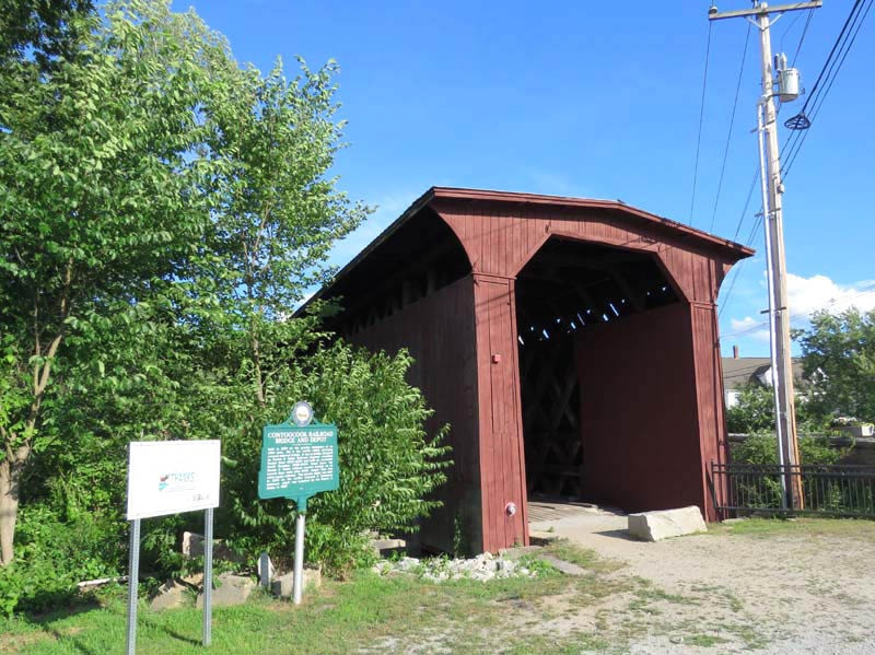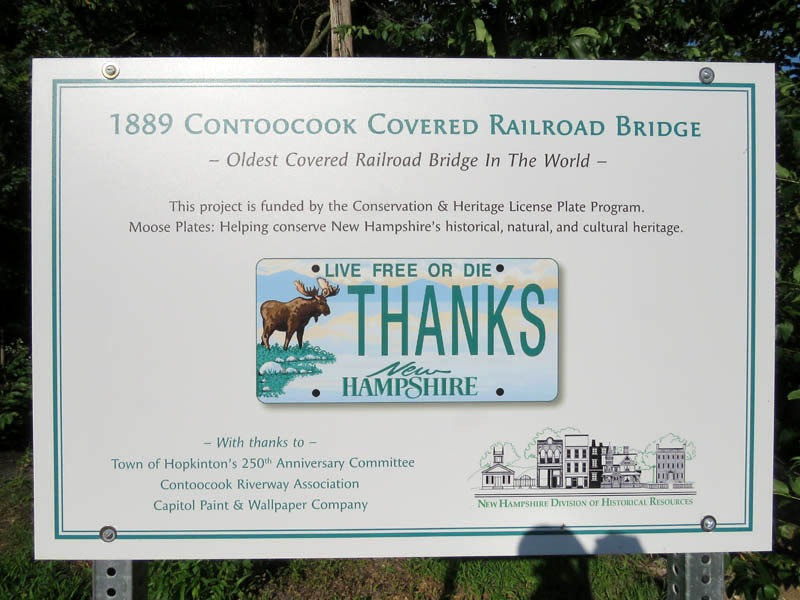 It is referred to in the National Register of Historic Places as the Hopkinton Railroad Covered Bridge, for the town of Hopkinton, New Hampshire, in which the village of Contoocook is located.