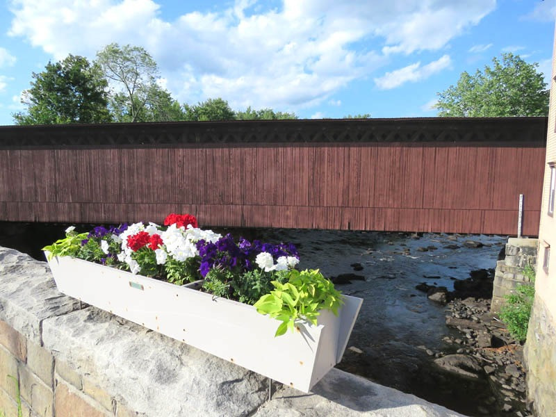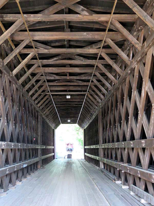 In 2006, the bridge saw minor structural repairs to its bottom chord at the upstream north corner, the bolsters were replaced for the first time since the hurricane of 1938, and the bed timbers were replaced by granite pedestals. The work was paid for by a donation from the National Society for the Preservation of Covered Bridges.
