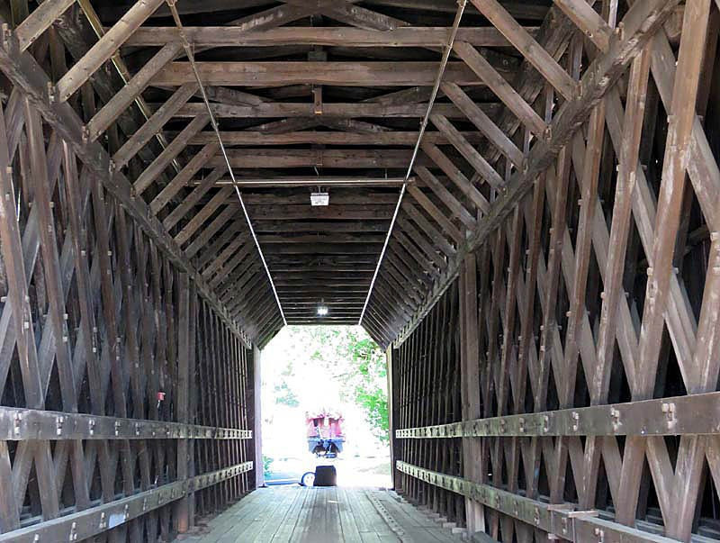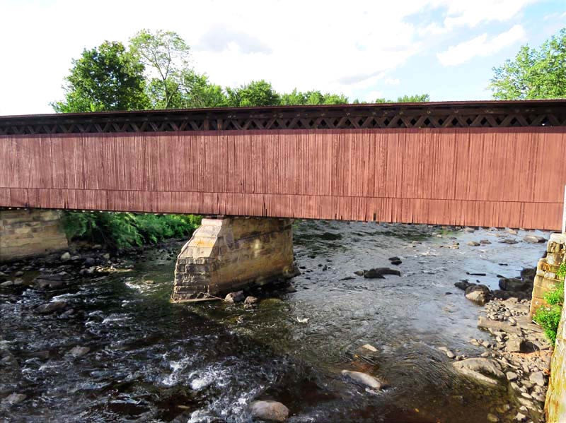 The bridge presents the clearest, most original structure of its type, as the others incorporate significant structural modifications. The main trusses are double Town lattice and are continuous over a central pier to form two spans of approximately 71 feet each. It has often been said they were built by the mile and cut off by the yard. The center pier is skewed to match the river flow, and the abutments were built at an angle to match the river's flow as well.