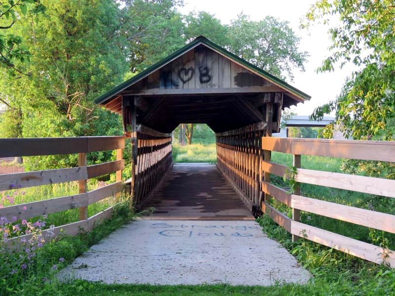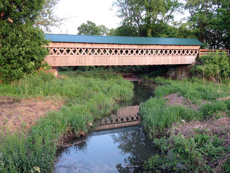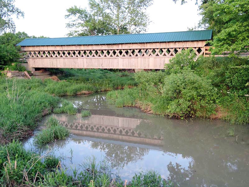 The Canal Greenway-covered bridge, built in 1991, spans an irrigation ditch off of the South Fork of the Licking River of the Canal Greenway Trail in Licking County, Ohio. The town lattice bridge measures 71 feet and is only 8 feet wide, and is open only to pedestrians.
