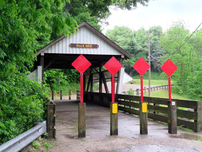 The Rock Mill Covered Bridge, on State Route 41 at Rock Mill, Ohio, in Bloom Township, Fairfield County, Ohio, is a Queen Post truss bridge. It is a single-span wooden covered bridge spanning a deep gorge of the Hocking River.