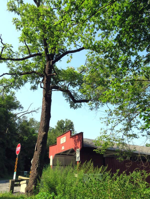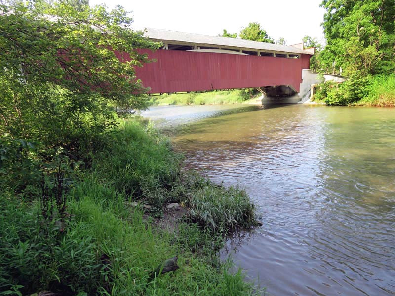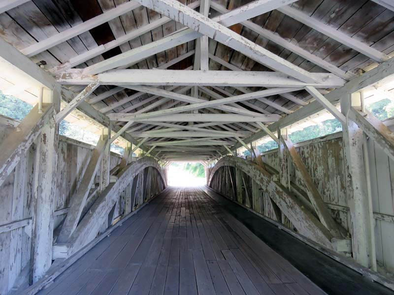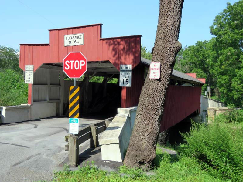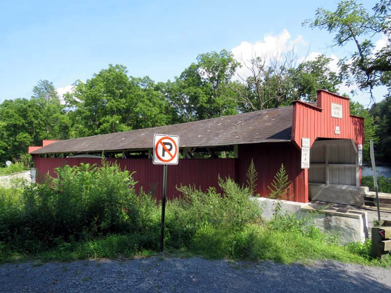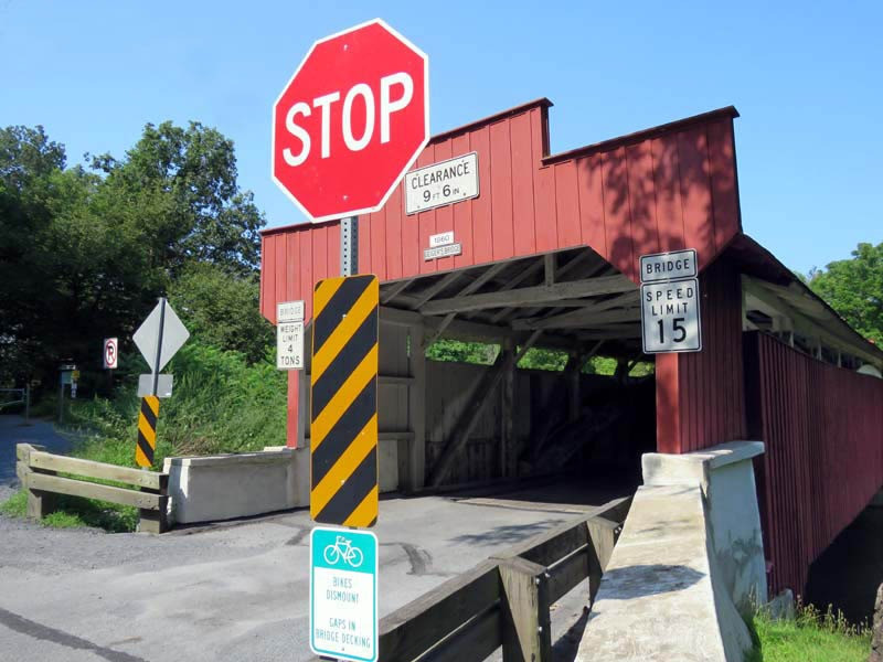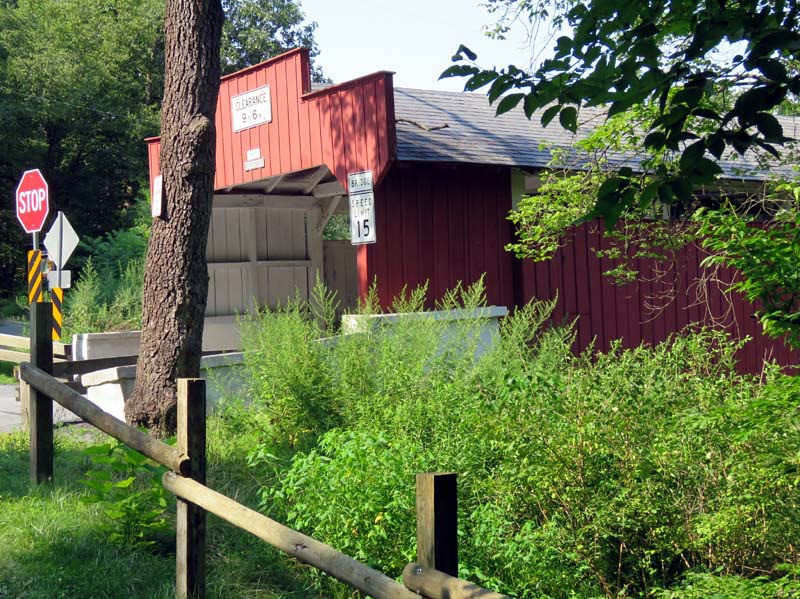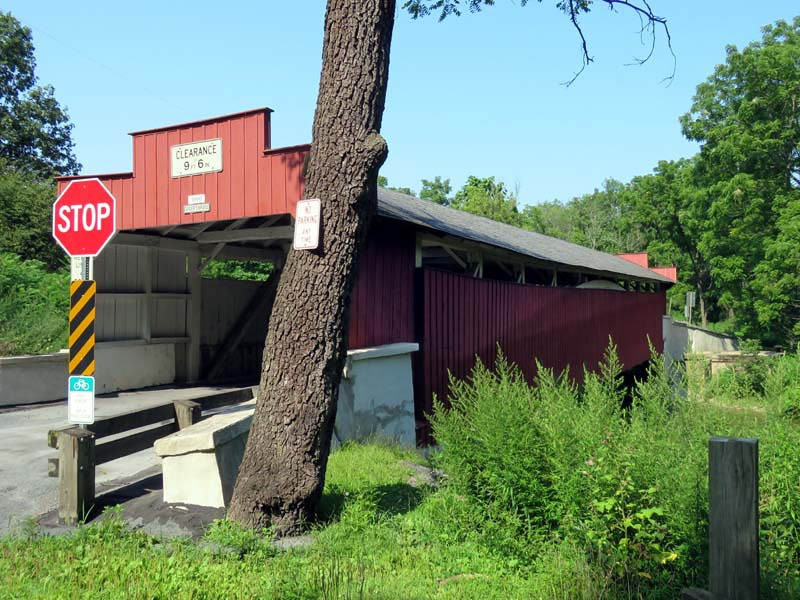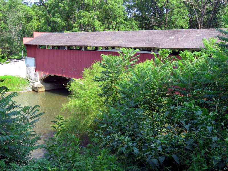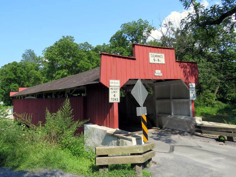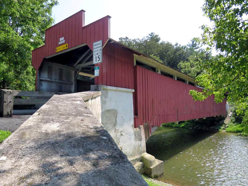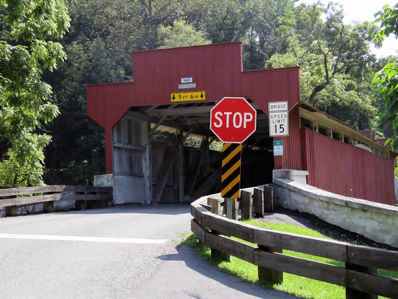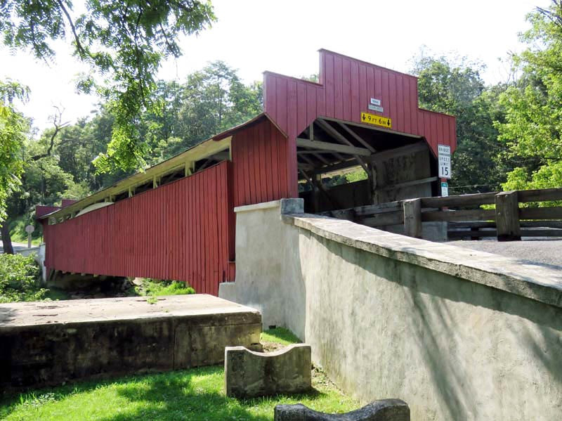 Geiger Bridge has vertical plank siding and an entry portal of stepped square planks, making it noticeably different from other bridges. This 17-foot-wide deck is open to traffic, crossing Jordan Creek. Lehigh County is the home of six covered bridges. Geiger Bridge is slated for rehabilitation in 2022.