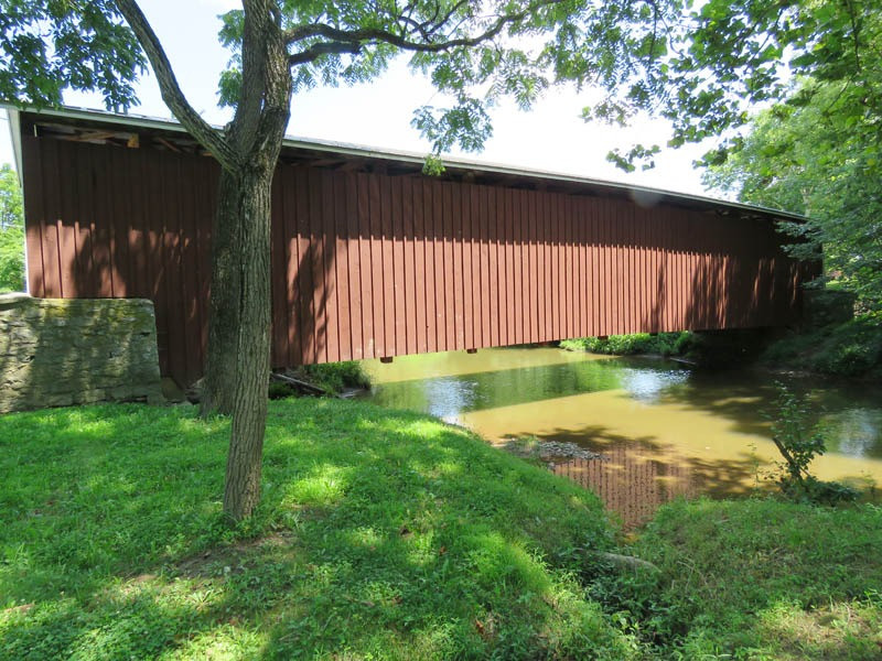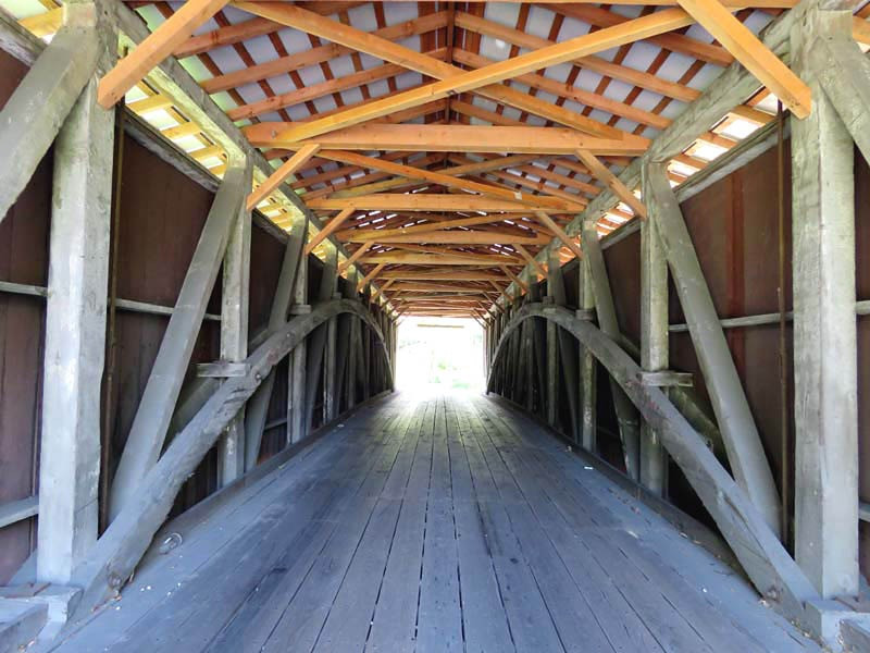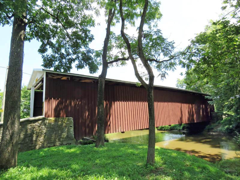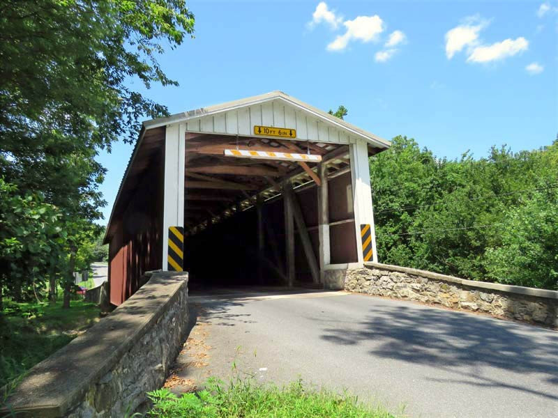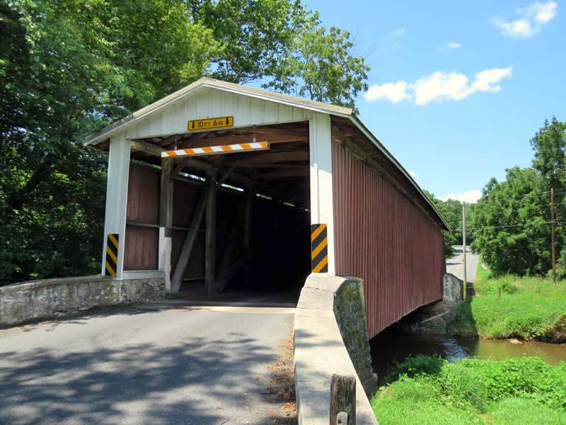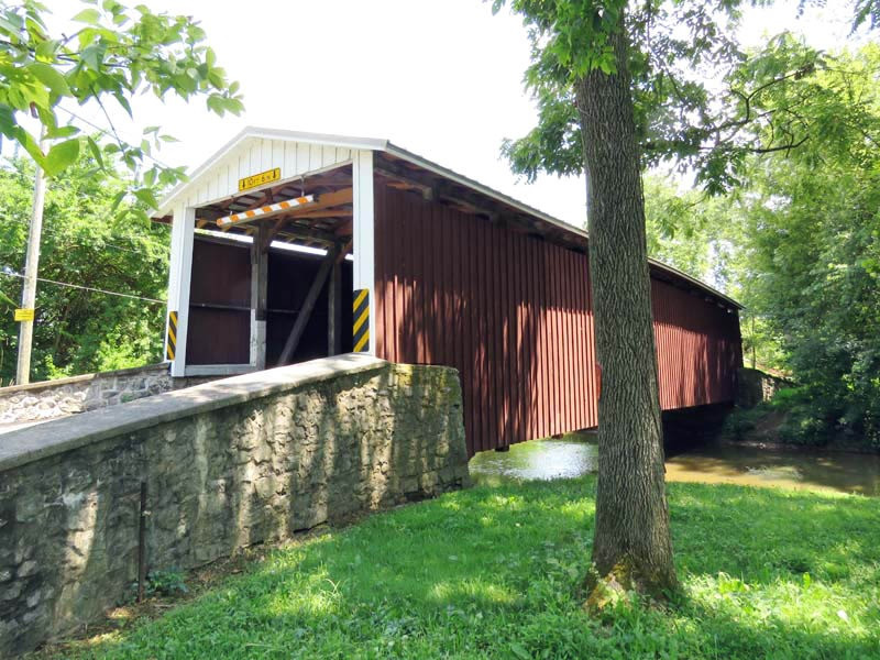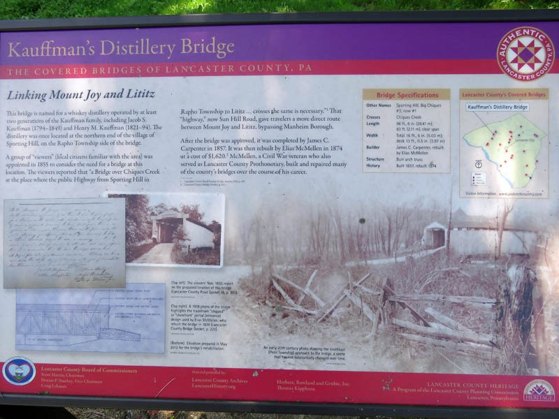 The bridge has a single-span, wooden, double Burr arch truss design with the addition of steel hanger rods. The deck is made from oak planks. The bridge is painted red, the traditional color of Lancaster County Covered Bridges, on both the inside and outside. Both approaches to the bridge are painted in the traditional white color. It is the second historic covered bridge on Big Chiques Creek. The bridge was originally built in 1857 and named for the nearby Kauffman’s Distillery Mill, which operated in the 1800s. At that time, Kauffman’s was one of 130 distilleries in Lancaster County alone. It was originally built for $1,185 by James C. Carpenter, one of nine covered bridges known to have been built by Mr. Carpenter. In 1874, the bridge was rebuilt by Elias McMellen for $1,620.