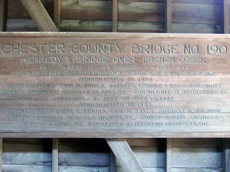 Kennedy Bridge was also damaged and repaired after a flood in 1884 and reinforced in 1936. When this bridge was rebuilt, they used bongossi (non-flammable wood from Africa). The present bridge is a duplicate of the original. The original bridge was built utilizing the Burr Arch for $2,149. This structure is in good condition, open to vehicle traffic, and crosses French Creek. The bridge is owned and maintained by Chester County.