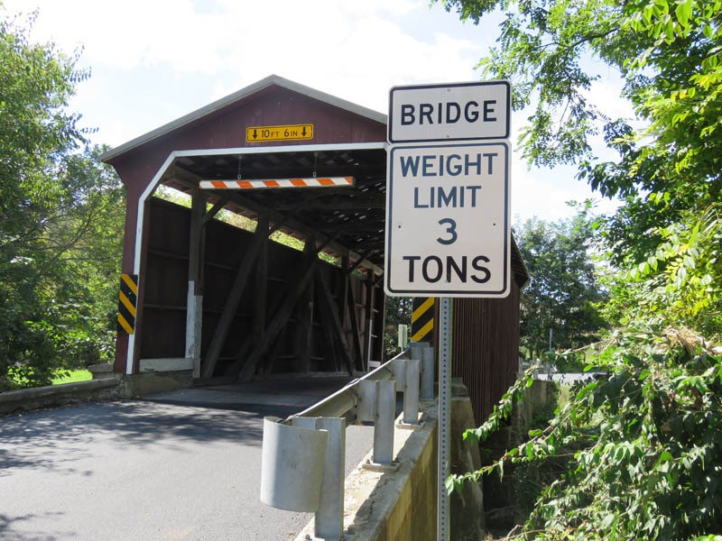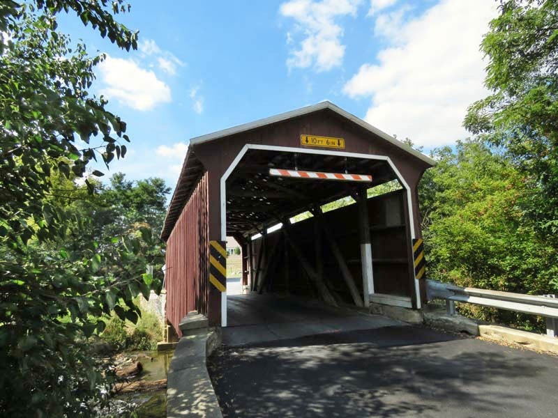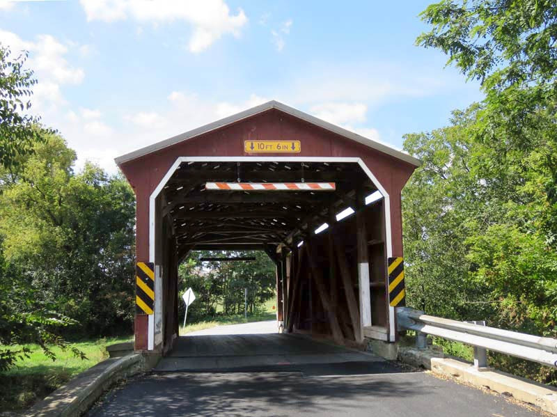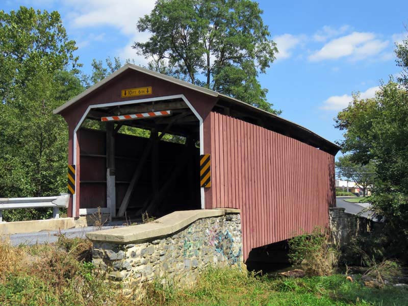 The 1873 Landis Mill Covered Bridge is a covered bridge that spans Little Conestoga Creek in Lancaster County, Pennsylvania, United States. A county-owned and maintained bridge, its official designation is the Little Conestoga #1 Bridge. The bridge, built-in 1873 by Elias McMellen for $969, is today surrounded by development, a shopping center, and highways on the boundary of Lancaster, Pennsylvania. At 53 feet, it is the shortest covered bridge in the county, with a width of 13 feet, an overhead clearance of 10 ft. 6 inches, and an under clearance of 8 ft.