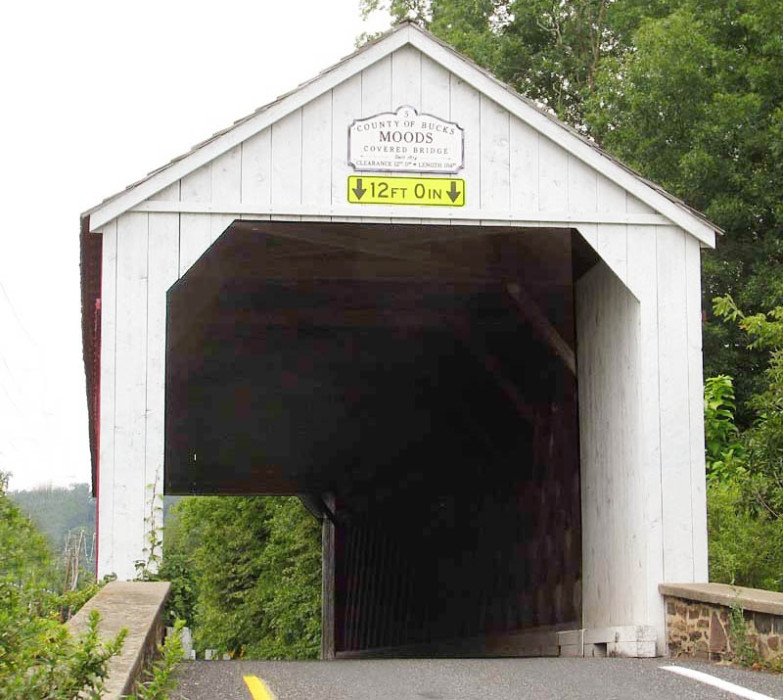 This bridge is almost in the town of Perkasie and has a large volume of traffic because of its location. There is a bike path and parking area at one end of the bridge, so this is a great place to stop and take a walk along the creek. In the spring of 2004, Mood's Covered Bridge was damaged by a truck and closed to traffic. Shortly thereafter, it was destroyed by fire. But in keeping with the Bucks County spirit of preserving our local history, a new replica-covered bridge was built using the period-type framework.