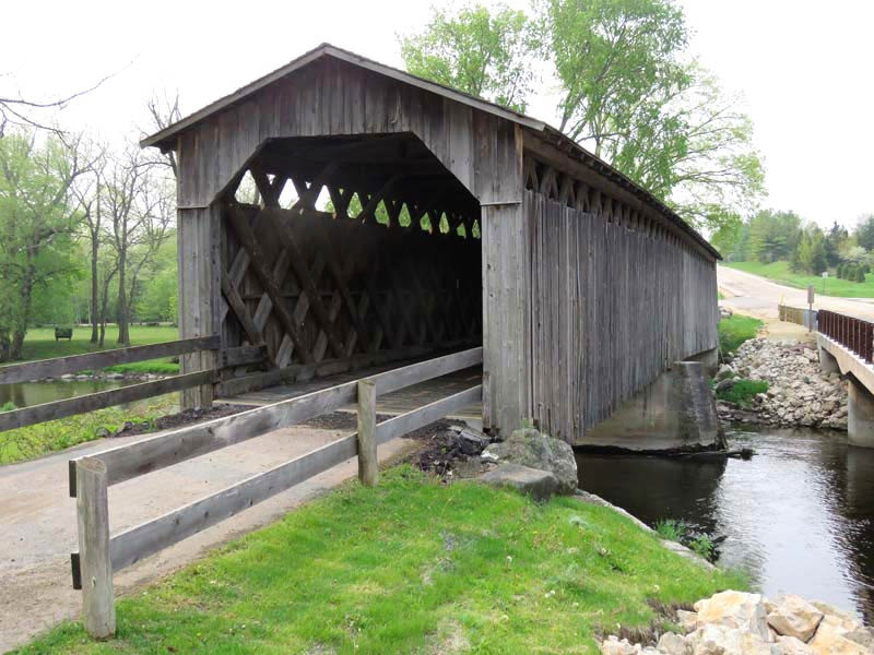 The 1876 Cedarburg Covered Bridge in Ozaukee County, Wisconsin, is the last remaining original covered bridge in the state, which once had approximately 40 covered bridges. Originally called Red Bridge, this 120-foot-long, two-span bridge made of pine with oak lattices was built to cross Cedar Creek. Situated in a north–south orientation, it is 17 feet wide and has a height of about 18 feet from the top of the abutments to the tip of the roof. The interior, from the deck to the top of the knee braces, is approximately 13 feet.