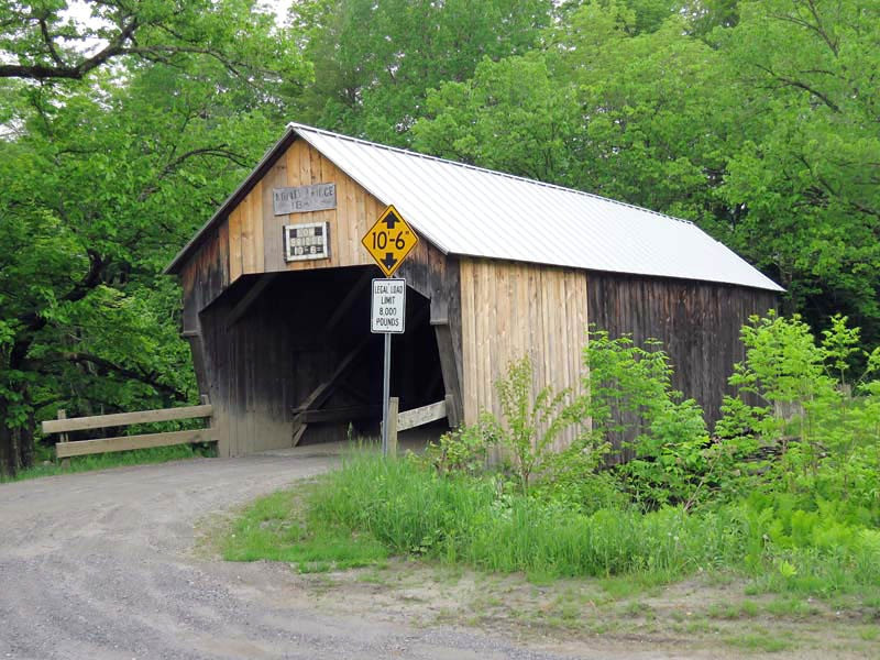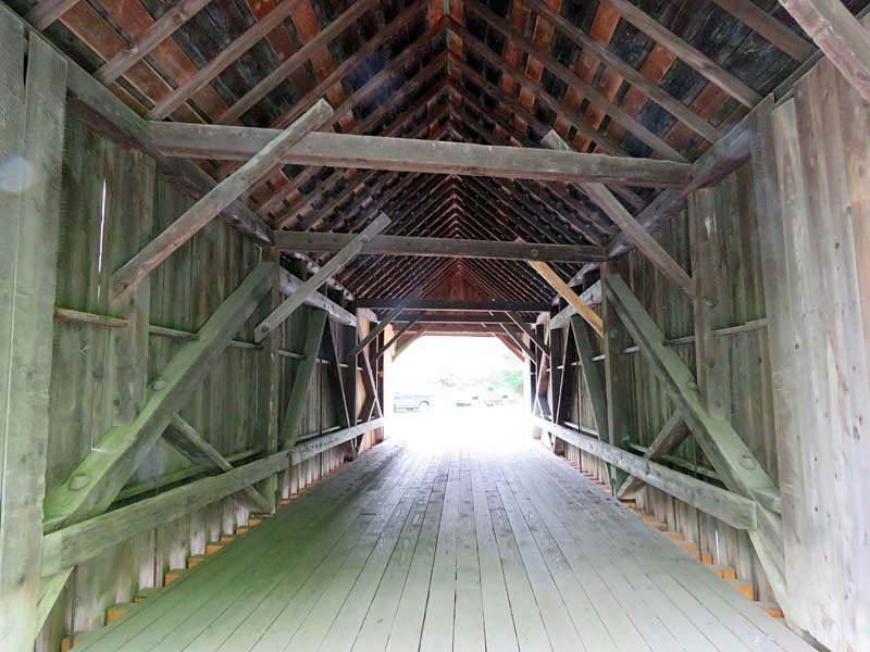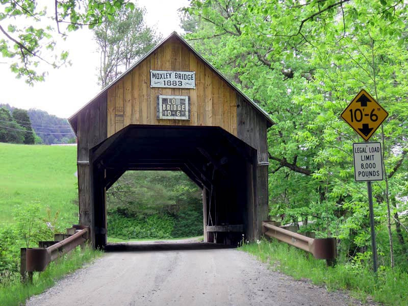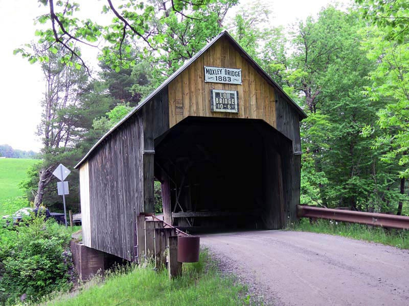 Moxley Bridge is Chelsea's only 19th-century covered bridge and is one of a concentrated group (most in neighboring Tunbridge) of covered bridges in the state. The Moxley Bridge is the northernmost in the string of bridges over the First Branch. It is noted for the long, hand-hewn bottom chords. A wooden ramp at the north portal helps keep the water away from the bridge deck. This is a "skewed" bridge, placed across the stream at a slant rather than a right angle, so its actual shape is a trapezoid.