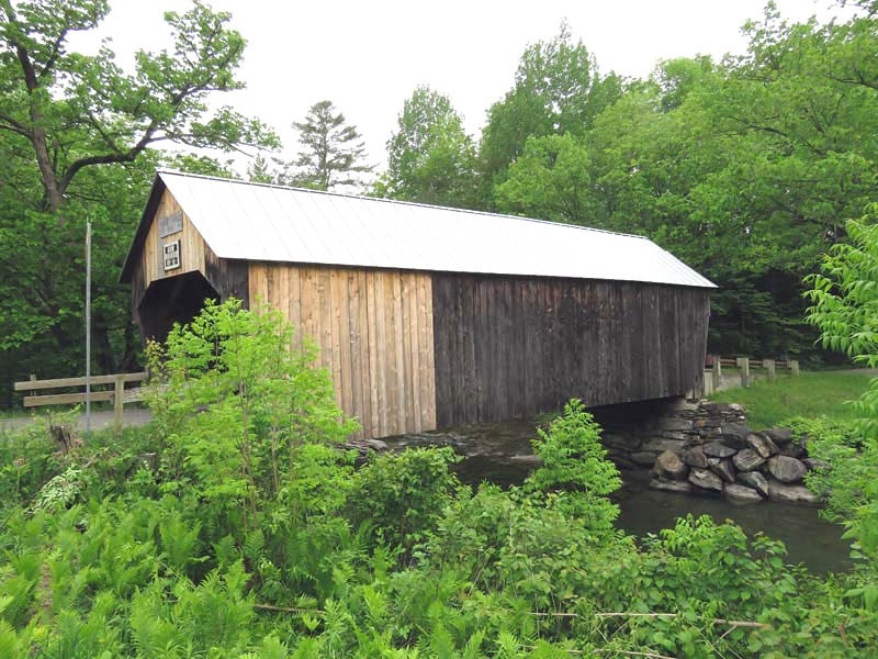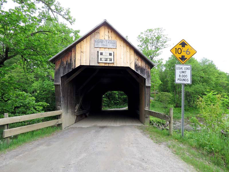The 1883 Moxley Covered Bridge, also called Guy Bridge, stands in southern Chelsea in Orange County, Vermont, about 2.5 miles south of the village center, on Moxley Road. It is a single-span multiple kingpost truss structure, resting on abutments of dry-laid stone and concrete facing. The southern abutment is set on a prominent rock outcrop. The bridge is covered by a metal roof, and its exterior is finished in vertical board siding, which extends a short way to the interior of the portals. The trusses include wrought iron rods and are set at an offset to one another, giving the bridge the shape of a parallelogram. A laminated beam has been bolted to the underside of the floor planking to provide additional strength.