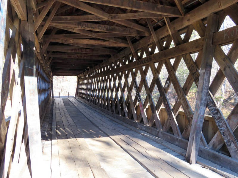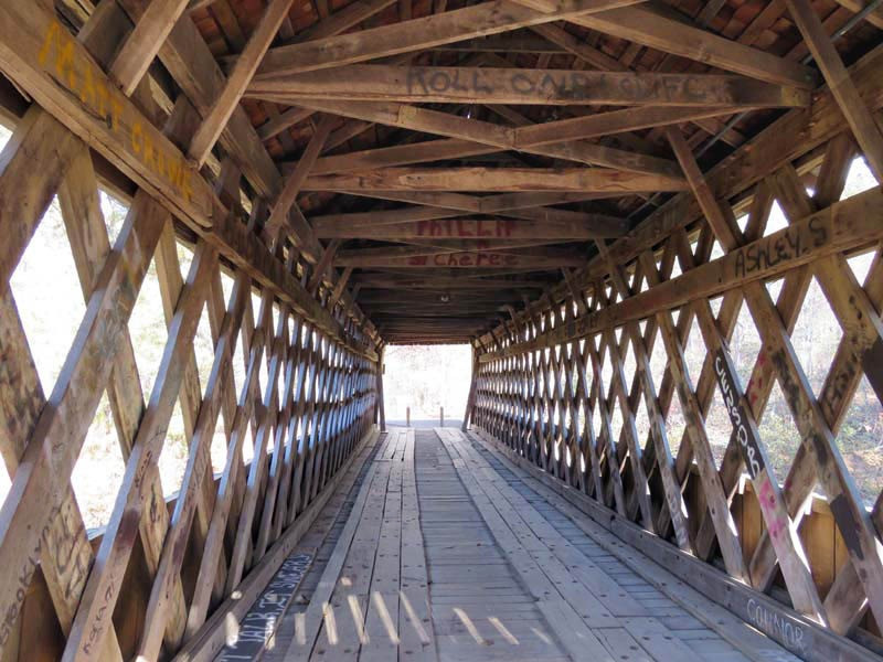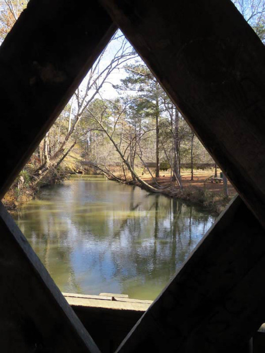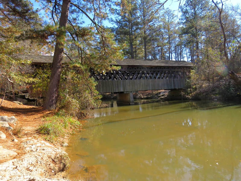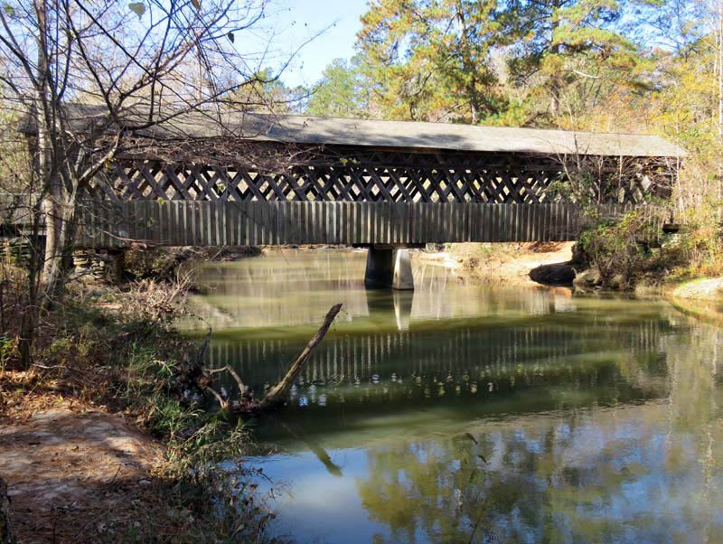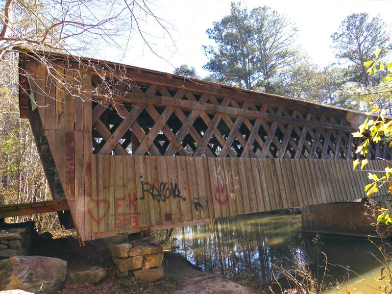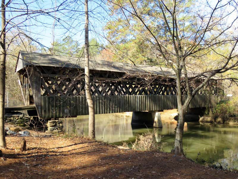An uncovered bridge was later added. With the 1838 removal of the Cherokees, the land was sold to Jacob Scudder. Dr. M.L. Pool purchased it from Scudder's family in 1880. Abandoned in 1947, the mill burned in 1959. The original bridge washed away in 1899 and was replaced with the present 96-foot-long and 14.5-foot-wide structure in 1901, crossing over Settendown Creek. Constructed in the Town lattice design by Bud Gentry, the bridge's web of planks crisscrossing at 45 to 60-degree angles is fastened with wooden pegs, or trunnels, at each intersection. It is now surrounded by a 10-acre state park, which includes nature trails, cascading falls, garden picnic tables with grills, a playground for the children, a large pavilion, restrooms, and a large parking lot.
