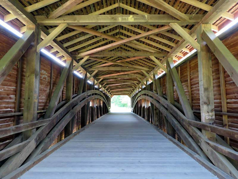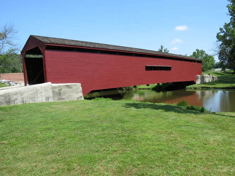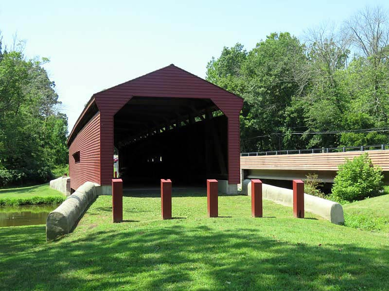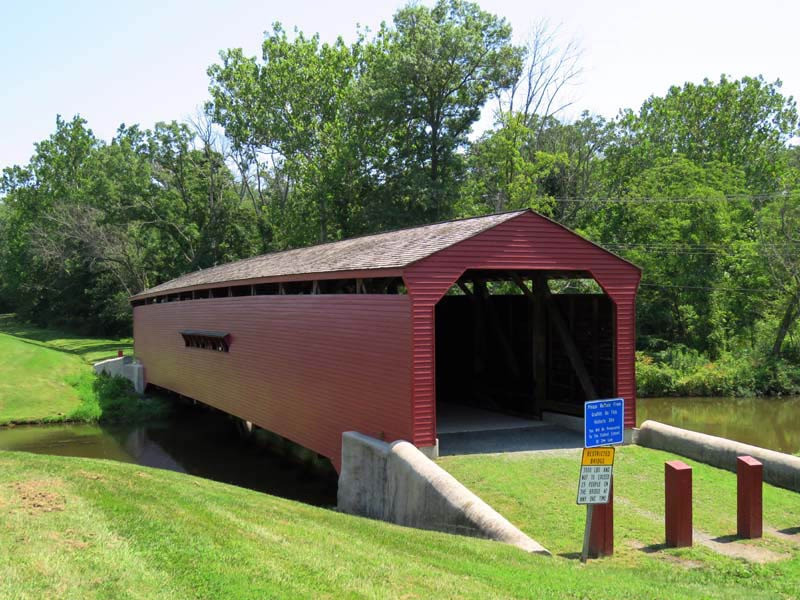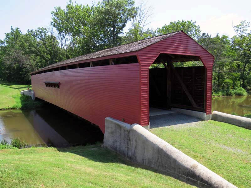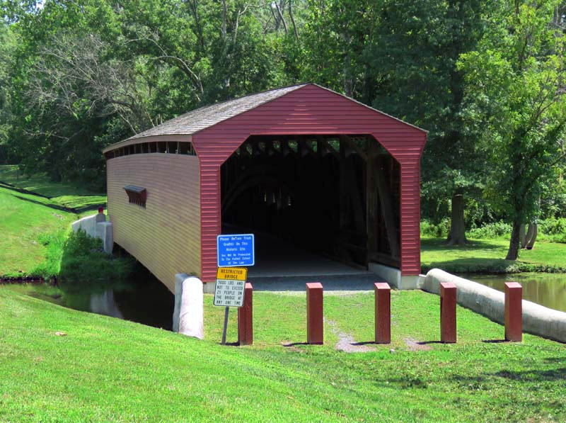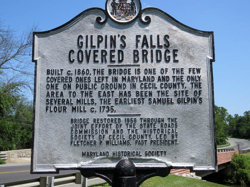 The 1860 Gilpin's Falls Covered Bridge, close to the town of North East in Bay View, Cecil County, Maryland, is a Burr arch through truss wooden covered bridge. Constructed by local Cecil County bridgewright Joseph George Johnson in 1860-61 across North East Creek. The bridge was erected near Samuel Gilpin's mills and dam and crosses the millpond formed by it with a span of 100 feet and a total length of 119 feet. It is 13.5 feet wide and is closed to all motorized vehicles.